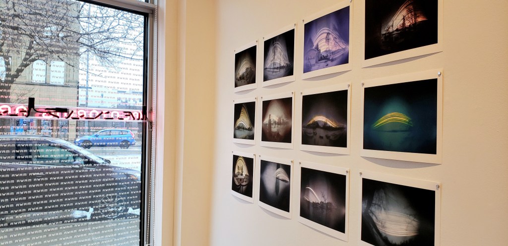 Installation of Solargraphy workshop participant prints at Tiny Gallery within MAWA, Winnipeg, Manitoba. April 2023